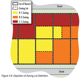 Zoning Lot: A contiguous area of property on one or more lots of record having the same owner, the entire area of which is within the same zoning district. Where a single lot of record has portions within different zoning districts, each portion within a different zoning district is considered an individual zoning lot. See Figure 3.6.