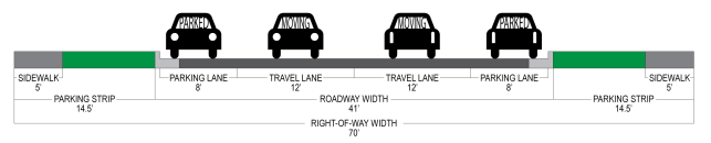 9.1.1. With parking on both sides of street: R-O-W width shall be 70 feet and roadway width shall be 41 feet.