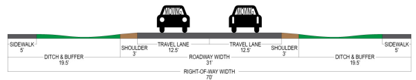 R-O-W width shall be 70 feet and roadway width shall be at least 31 feet.