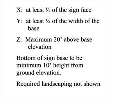 (4) Elevated Sign: Any sign placed upon, or supported by, the ground independent of the principal structure on the property where the bottom edge of the sign face is ten feet or more above the ground level, the overall sign height is no more than twenty (20) feet, the supporting structure of the sign is at least half the width of the sign face, and the base height is at least ¼ the width of the base.