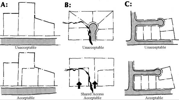 Normally, lot shapes are rectangular or pie-shaped. This pattern works well in some cases; rectangular lots are important when lots are rather small since they provide a maximum buildable area. Pie-shaped lots can be very inefficient. The most important element is that the lot contains a building construction envelope adequate for conventional house design. Lot shapes may be irregular under the following circumstances (see Figure 08.150):