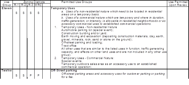 (2) The letter “S” means the use is permitted subject to the conditions specified for a Permitted Use, and the specific criteria referenced to in the by the use group for a Use Permitted Upon Review.